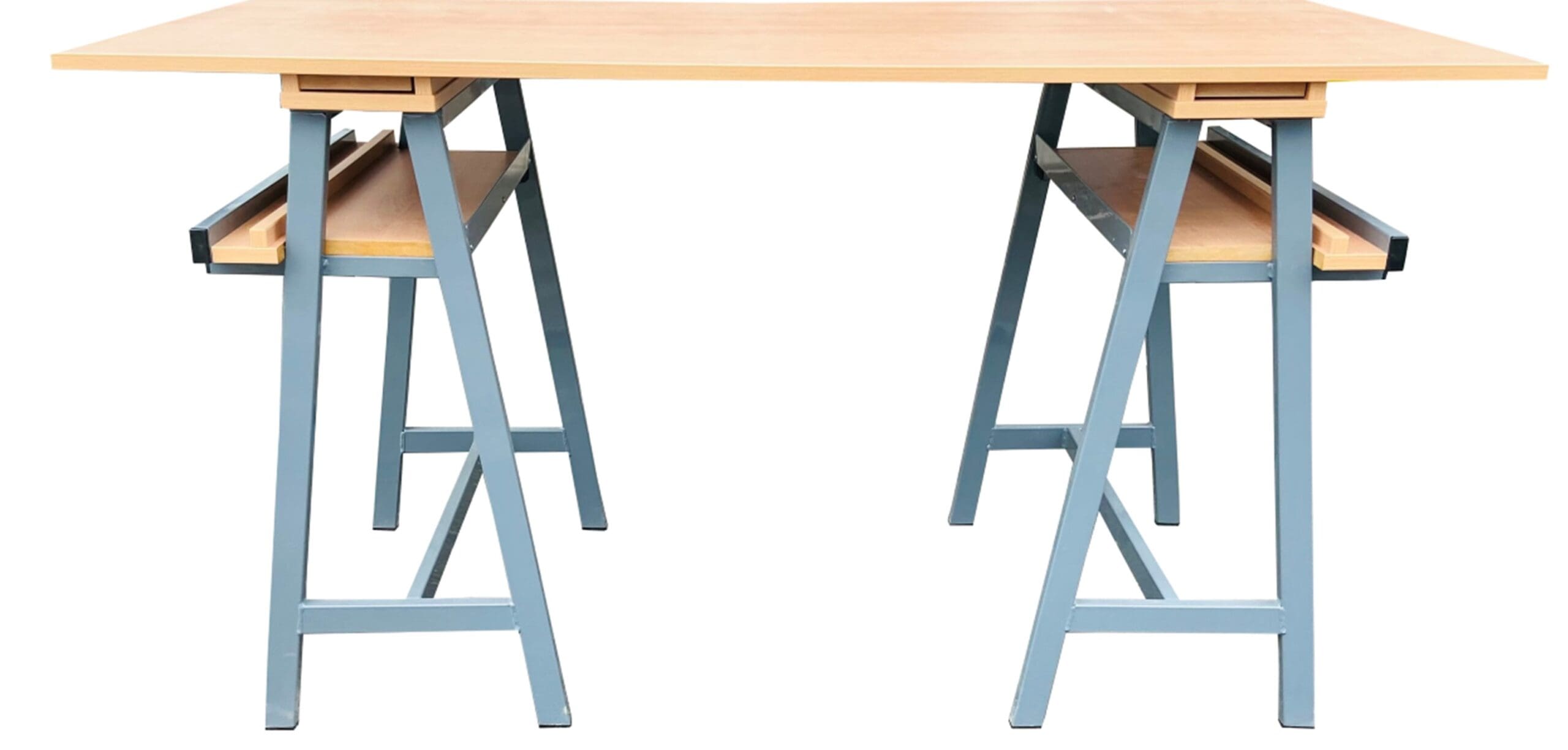 Traditional art trestle table with two removable trestles. Heavy duty construction with fully welded frame. Trestles are manufactured out of 40 x 20 mm rectangular tube. The advantages of a fully welded frame is as compared to timber frame steel tube cannot shrink and joints cannot bcome loose.