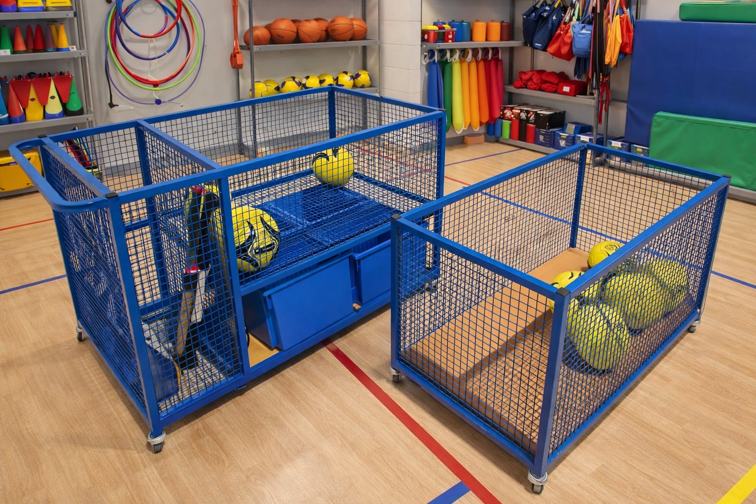 These units are rugged and strong enough for an assortment of balls. Heavy duty non marking swivel casters for easy transport. Protective powder coating (blue) for longer life. Will store up to 20 basketballs and up to 30 volleyballs.