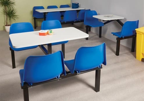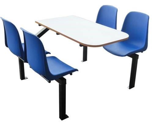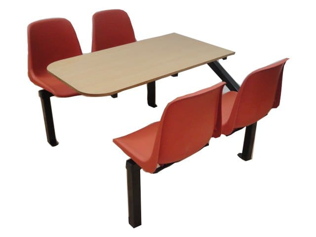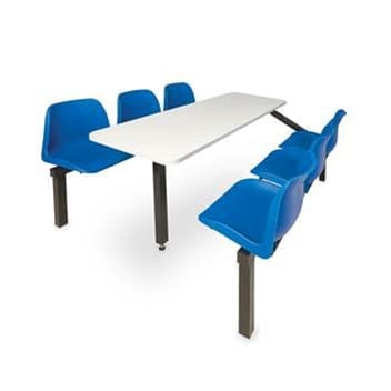 Our Cafeteria tables are perfect for lunch rooms. Easy clean and maintain . Frame colour black or grey. Ideal for high traffic areas. Can be floor fixed Available in two, four and six seat versions. Seat colours: black, brown, red, blue and green.