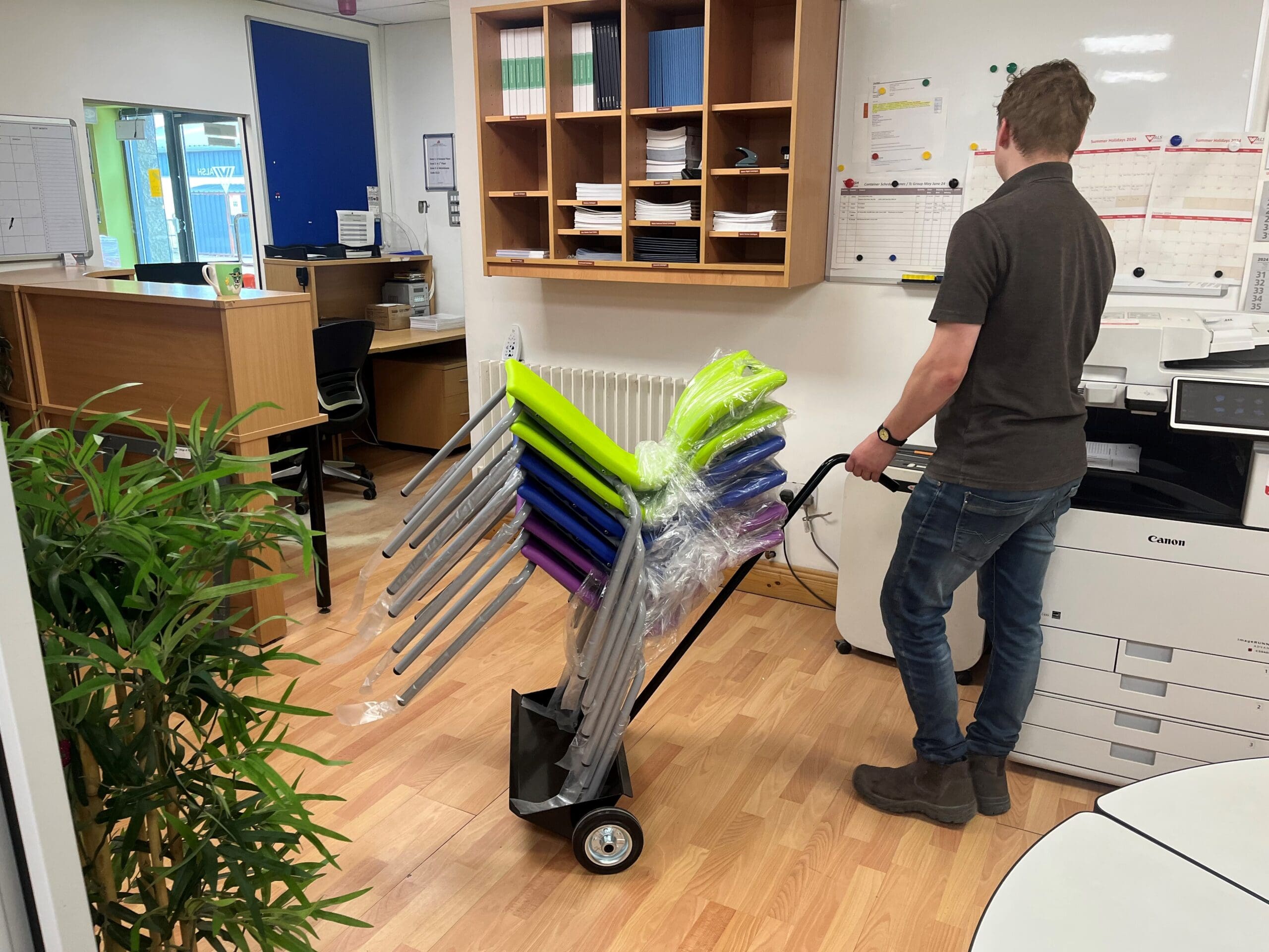 This practical chair trolley is designed to easily transport and store stacks of chairs, helping to streamline organization and maximize space in offices, classrooms, or event venues such as gyms
