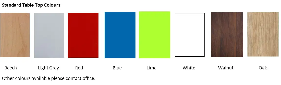 Traditional heavy duty classroom table with fully welded construction. Bullnosed polished table top edges aith radiused safety corner. High density plastic insert feet. Available in a wide range of colours of both frame and Top.