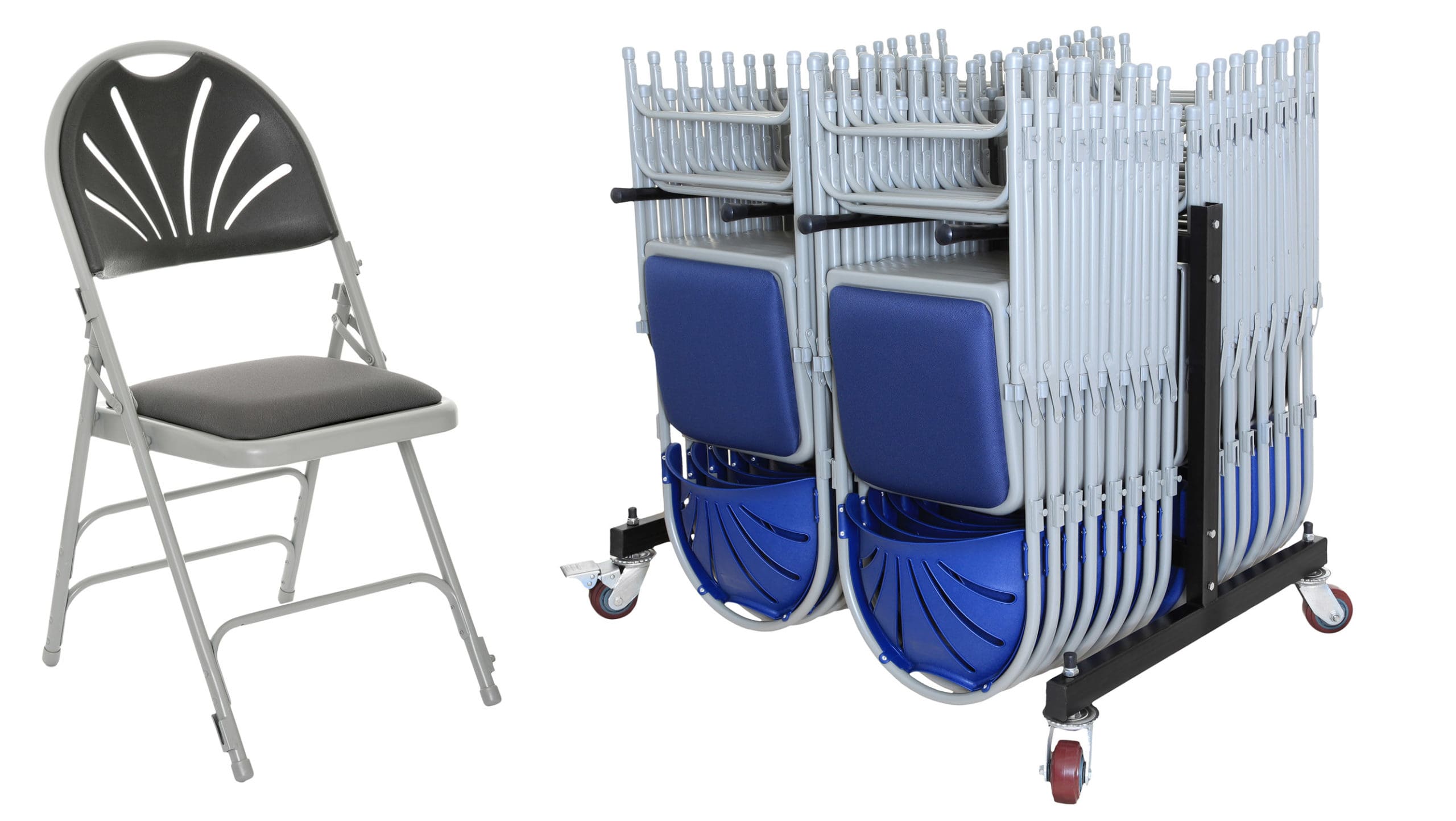 Folds and stores neatly away on a choice of chair trolleys – great for quick and easy set up, as well as compact storage