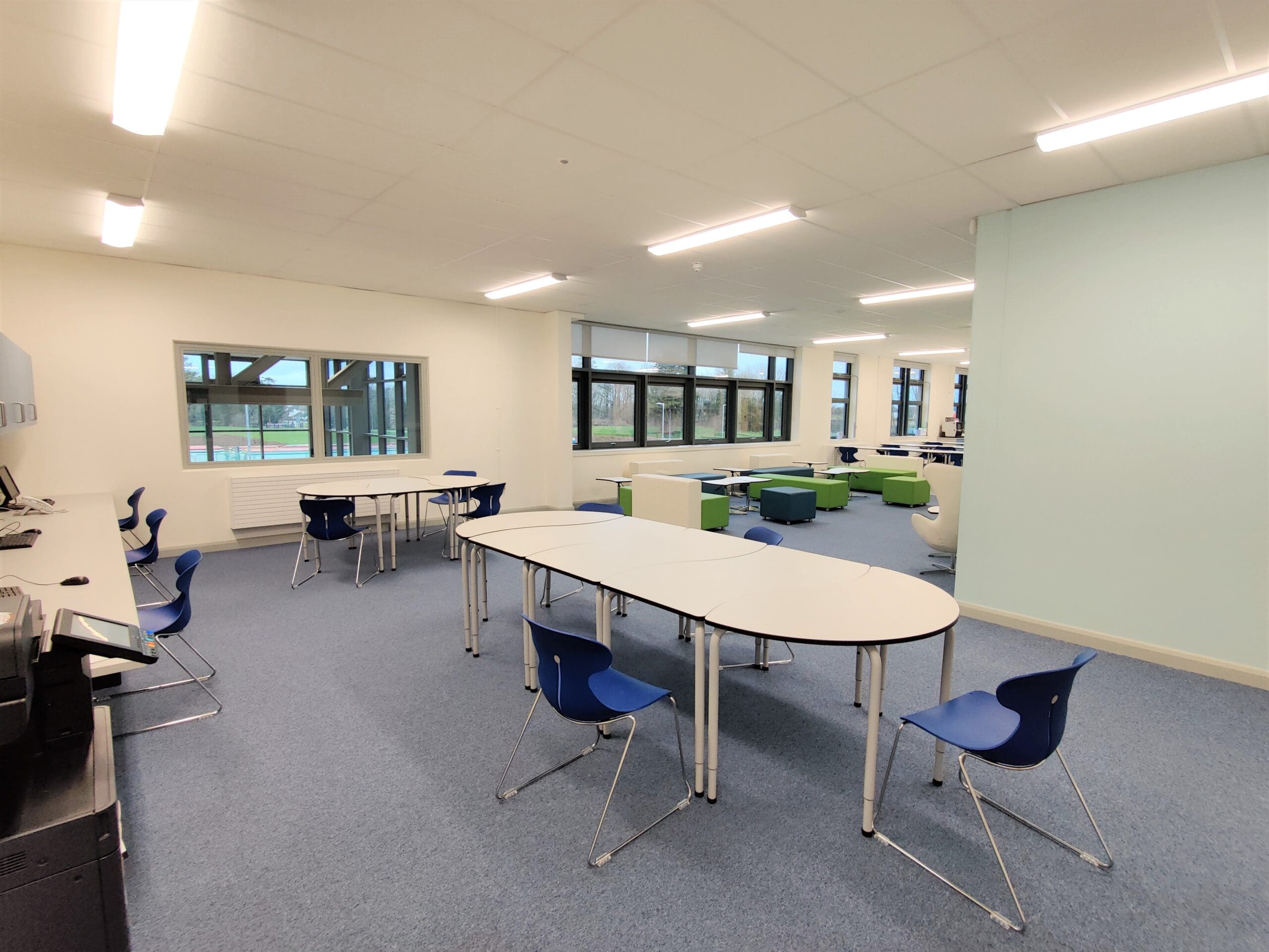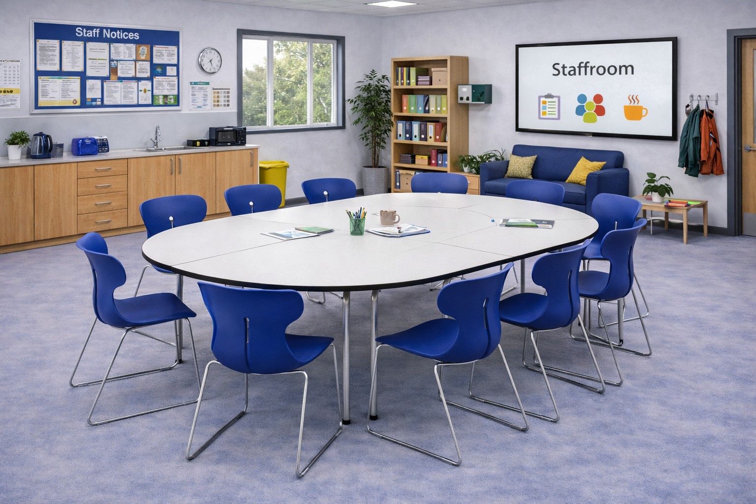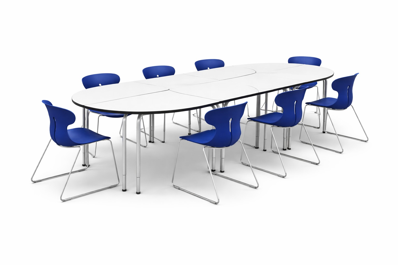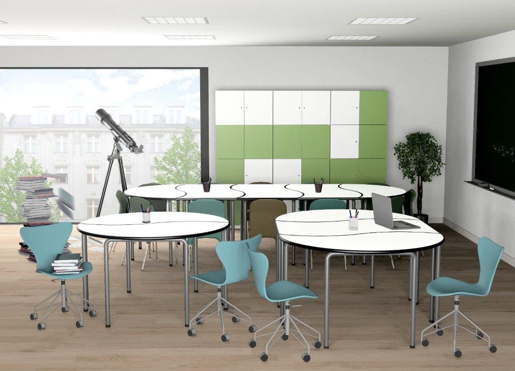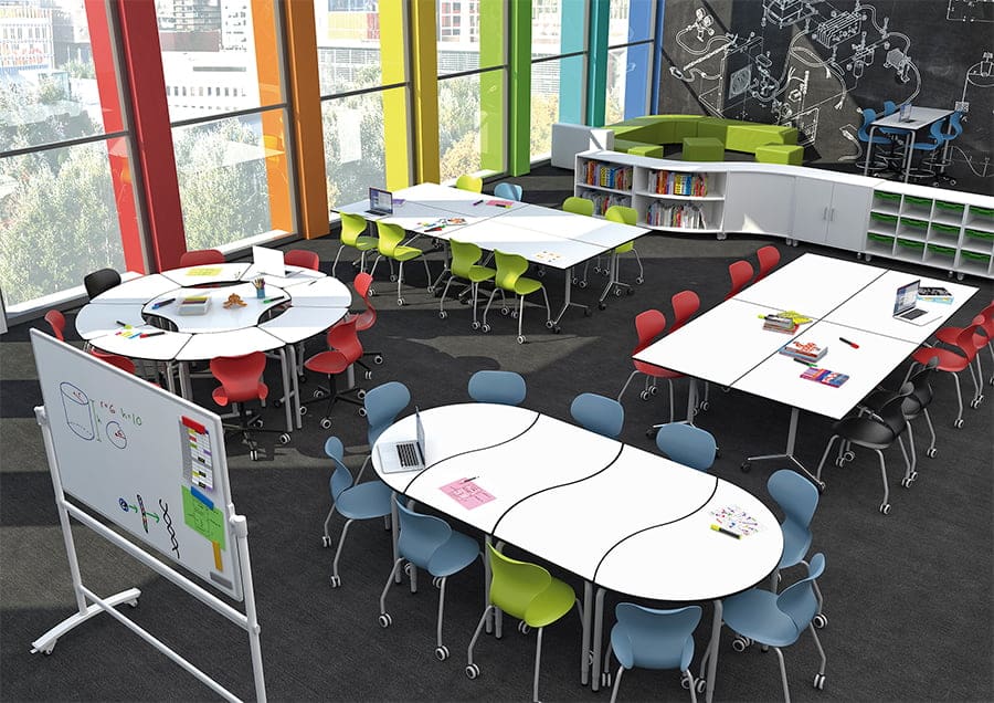 School table with metal structure and white finish. Table to equip cooperative learning classrooms that allows different combinations to work in groups or individually.