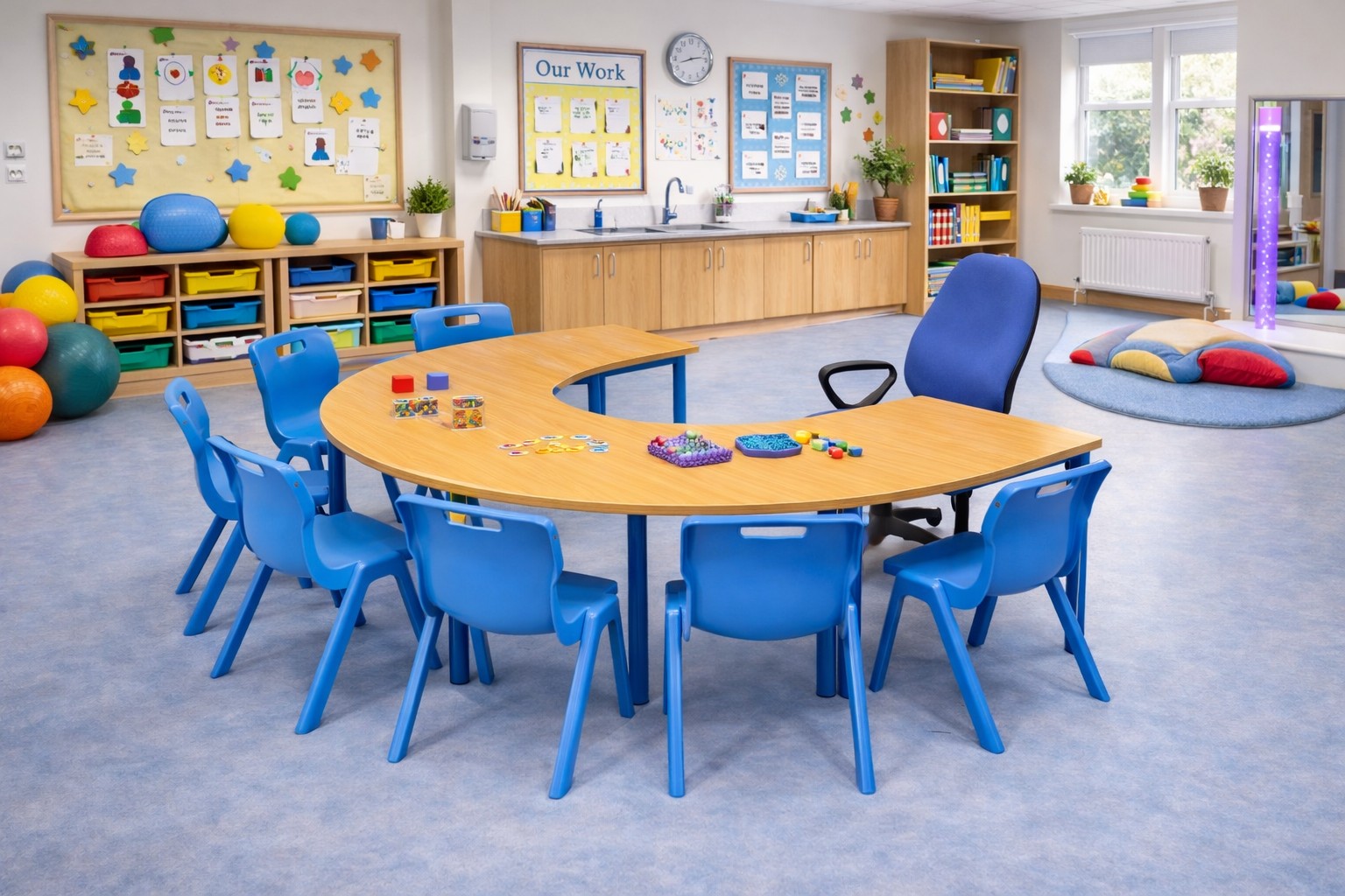 National School Horseshoe Tables, 6 sizes available, colour coded to suit class/age group.