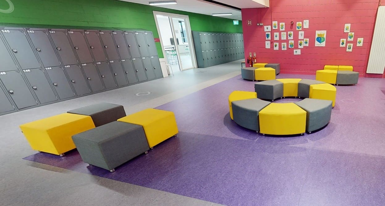 Wedge sofa element on fixed plastic feet. Covered in washable padded vinyl three colours available .Can also be used with the Cube, Tube & Sofa elements to create a multitude of seating arrangements in vibrant colour combinations.