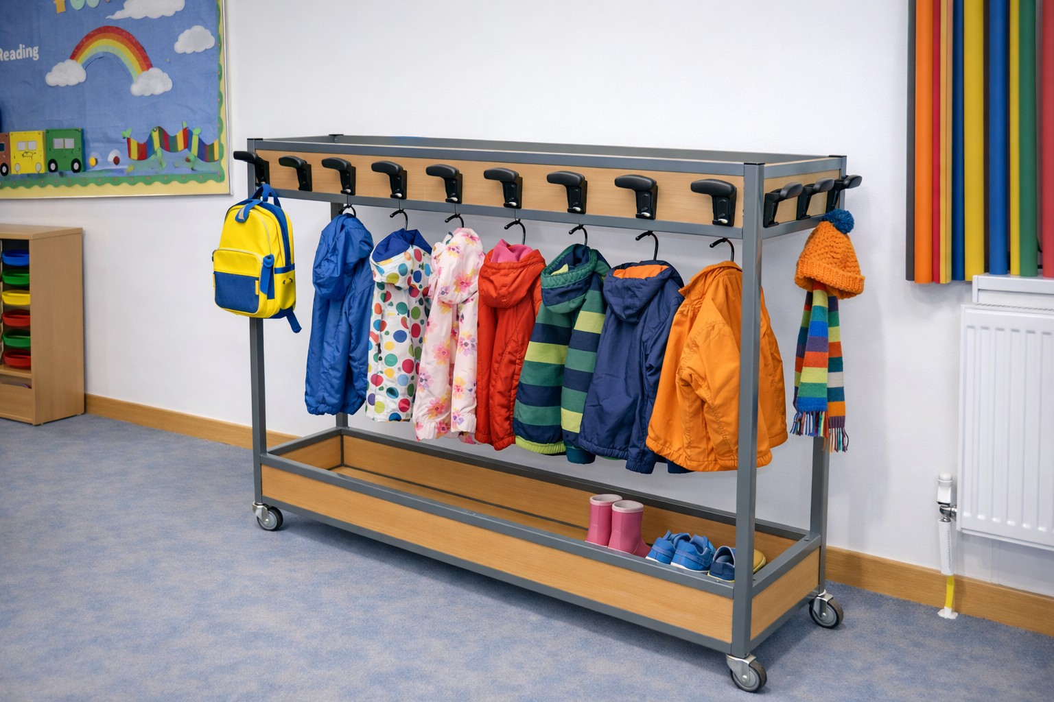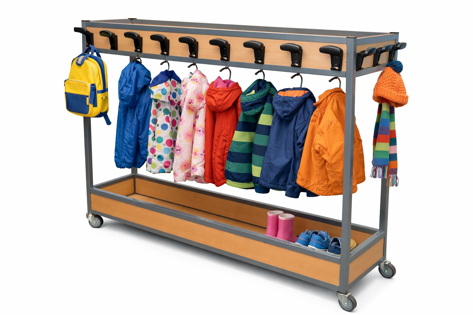 Mobile coat rack with 24 double safety hooks. Ideal to keep classroom tidy. Handy storage on top and bottom for lunch boxes or shoes. Includes locking castors. Available in a variety of colours.
