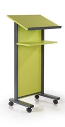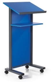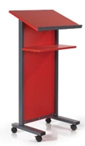 Made from beech wood and are finished in a variety of colours. The mobile lectern have four castors, two of which can be locked to ensure the mobile podium or lectern does not move. These units have an angled shelf ideal for the speaker’s notes, and a second shelf which can hold a laptop, or water or anything else that is required by the speaker.