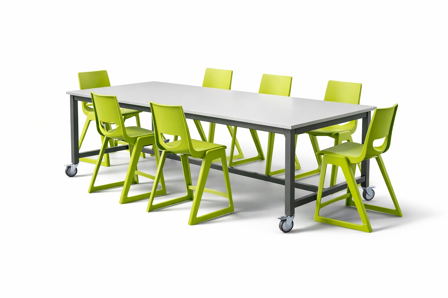 Heavy duty moveable bench manufactured out of 50 x 50 square tube. Frame is made ridgid by the provision of two low cross rails and one centrally located tie rail. Four heavy duty rubber tyred non marking castors fitted, braked diagonally. All our Benches are manufactured in Ireland using highly skilled Irish craftsmen. We can alter any dimension to suit the customers specific needs. All our tables are plastic powder coated to any RAL or BS colour. 12 year framework guarantee.