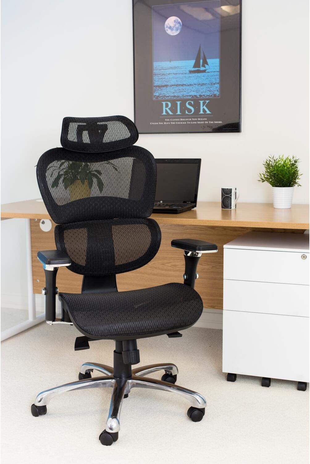 A contemporary office chair that provides full support for its user – with a mix of black and chrome for a modern look. A lock-tilt mechanism with adjustable torsion control, headrest and adjustable arms ensures user comfort.