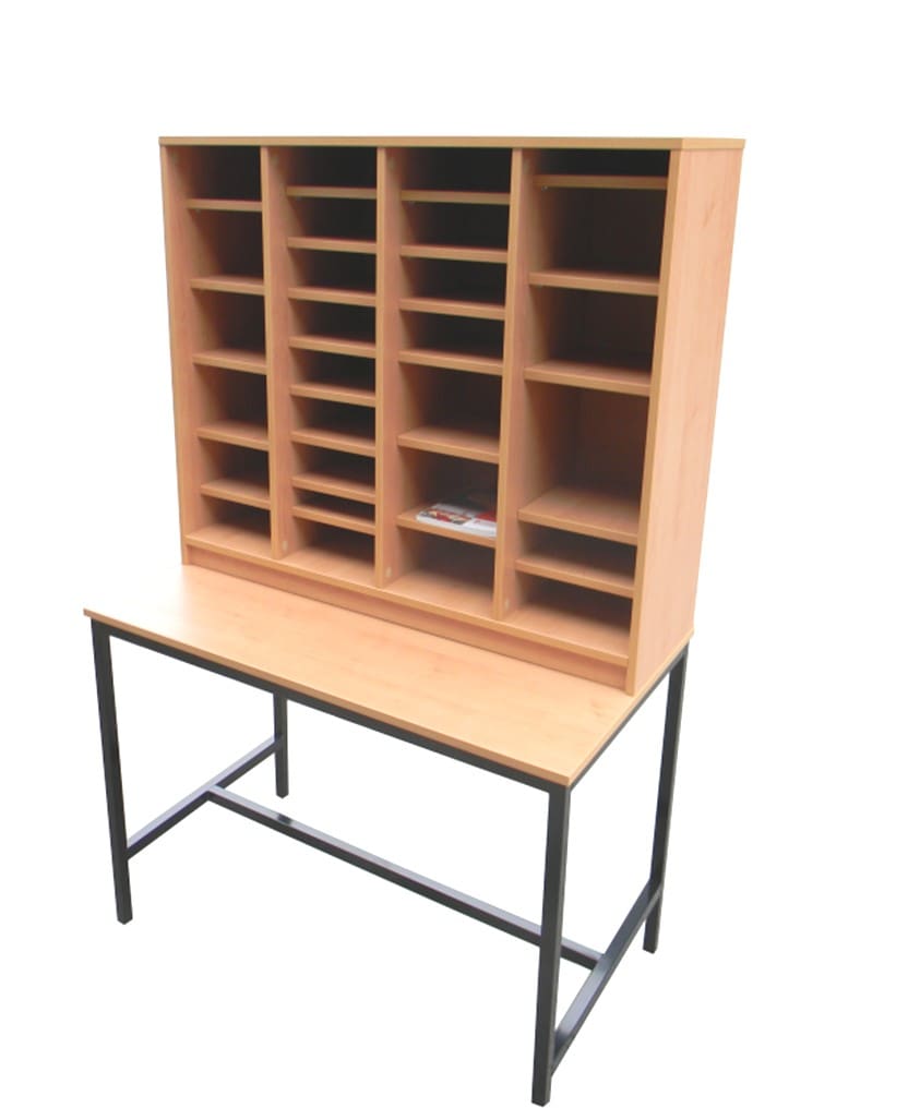 New pigeon hole unit with 24 adjustable shelves. Shelves can be adjusted to give different size openings.  Available in different colours (Beech, grey, Lime Red and Blue ). Perfect solution for a clutter free staffroom. Can be manufactured to any configuration. Including Table.