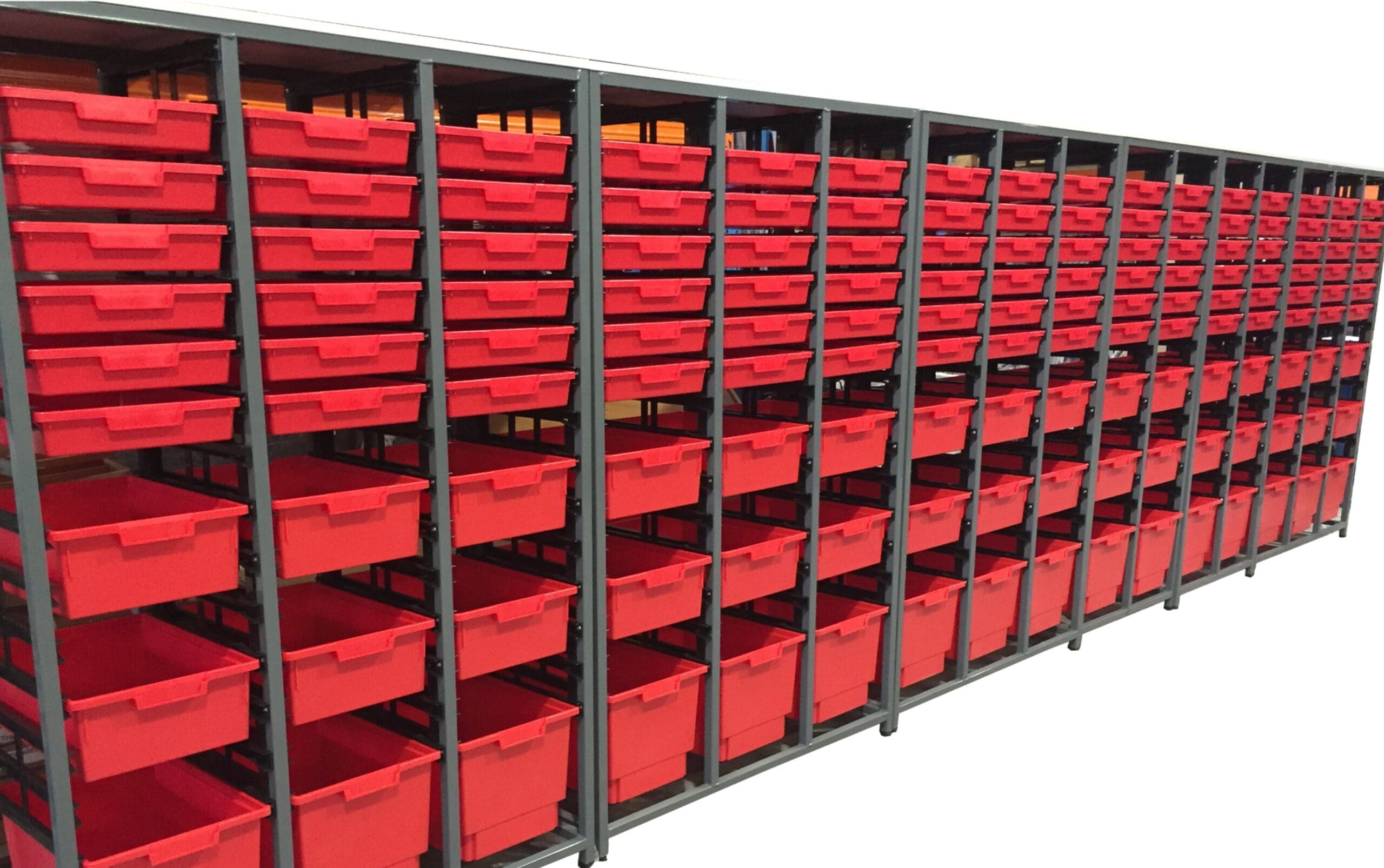 All our Science tray storage systems are manufactured in Ireland using Certwood science trays. All units include the award winning GLIDE & TILT runner system which includes a intergrated arrestor which holds the tray at an angle in the open position. All the images are exactly to the Department of Education’s specifications showing the trays that will be supplied. Extra trays can be purchased at any stage. Please see next page for full range of colours available. Our adjustable frames compliment our trolley range and provide large storage for equipment. Using the same runner and tray system a wide range of storage combinations can be created to optimize space.