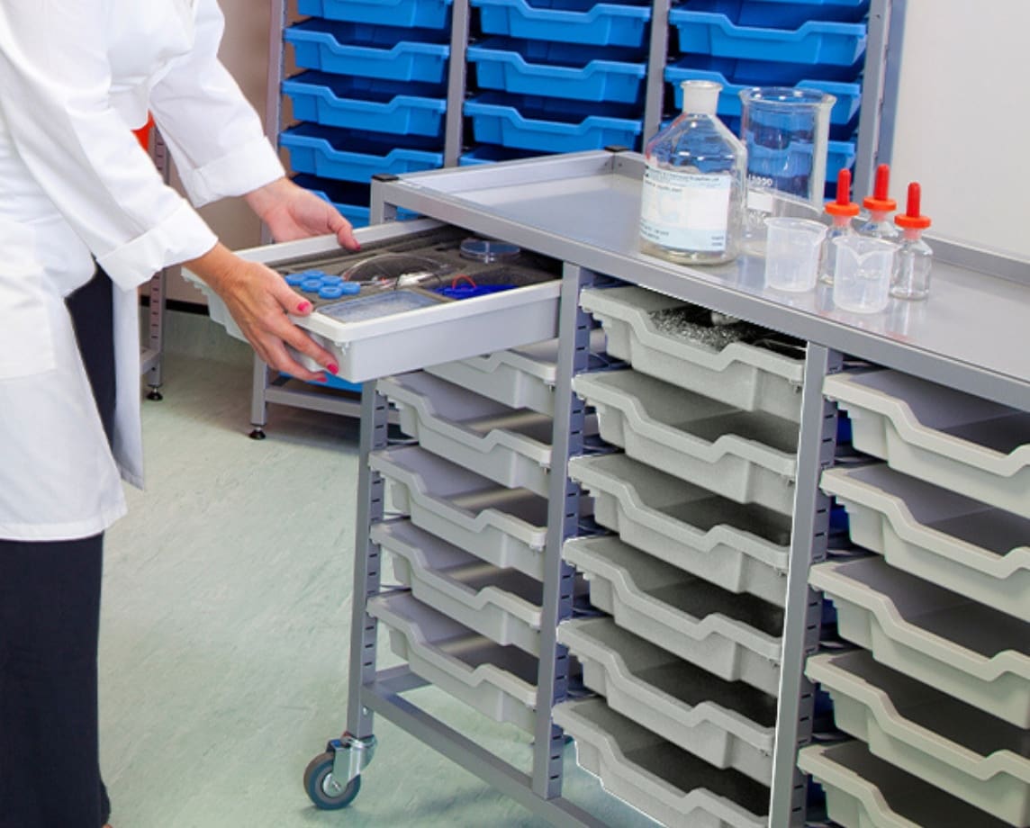 All our Science tray storage systems are manufactured in Ireland using Certwood science trays. All units include the award winning GLIDE & TILT runner system which includes a intergrated arrestor which holds the tray at an angle in the open position. All the images are exactly to the Department of Education’s specifications showing the trays that will be supplied. Extra trays can be purchased at any stage. Please see next page for full range of colours available. Our adjustable frames compliment our trolley range and provide large storage for equipment. Using the same runner and tray system a wide range of storage combinations can be created to optimize space.