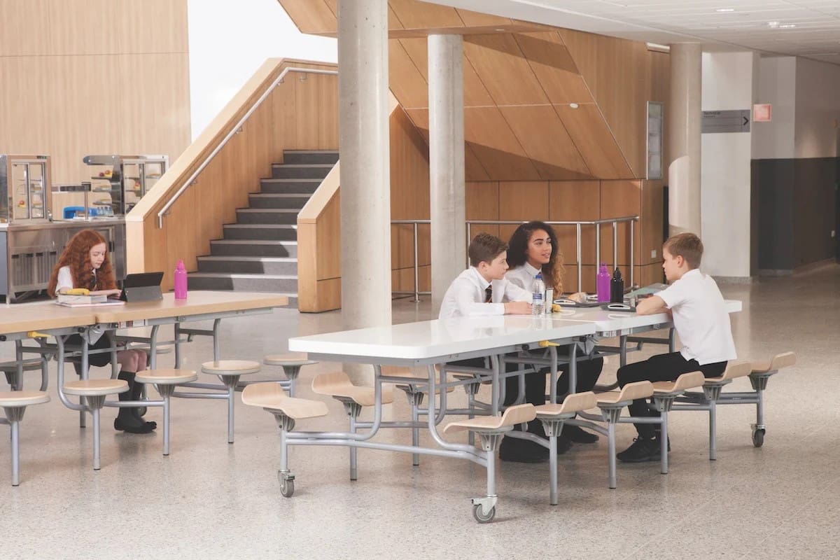 SPACERIGHT Table Seating Unit with 12 attached seats, features an contempoary design and rugged construction, that can withstand the hard use expected in an educational setting.